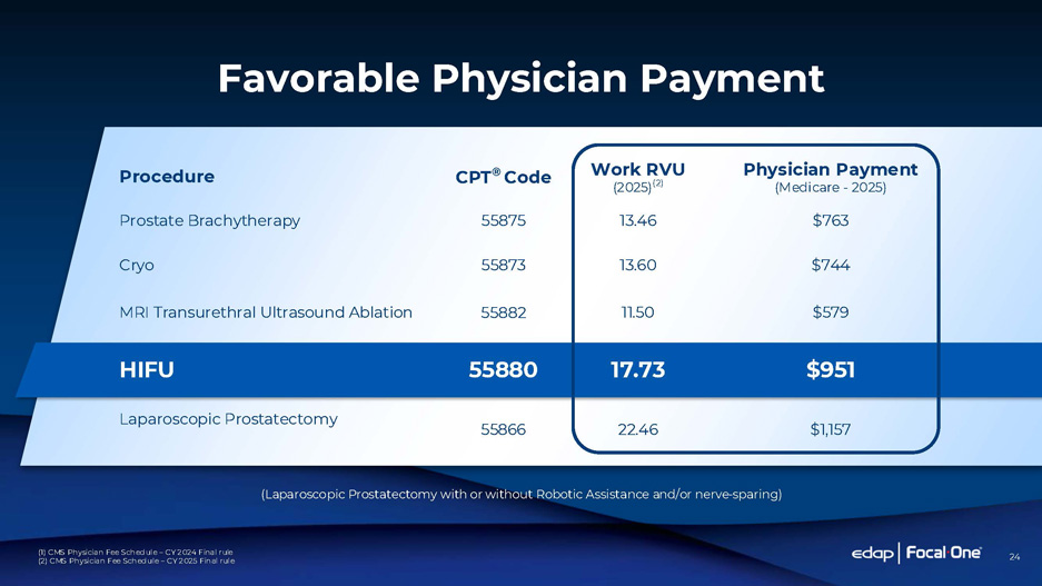 24 Favorable Physician Payment (Laparoscopic Prostatectomy with or without Robotic Assistance and/or nerve - sparing) (1) CMS Physician Fee Schedule – CY 2024 Final rule (2) CMS Physician Fee Schedule – CY 2 025 Final rule Physician Payment (Medicare - 2025) Work RVU (2025) (2) CPT ® Code Procedure $763 13.46 55875 Prostate Brachytherapy $744 13.60 55873 Cryo $579 11.50 55882 MRI Transurethral Ultrasound Ablation $951 17.73 55880 HIFU $1,157 22.46 55866 Laparoscopic Prostatectomy