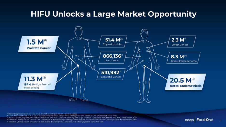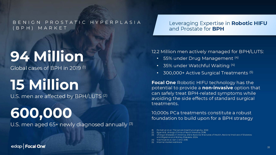 31 HIFU Unlocks a Large Market Opportunity (1) Newly Diagnosed Cases per year From World Health Organization – Globocan 2022 (2 ) From WHO and Habib N et al. Bowel Endometriosis: Current Perspectives on Diagnosis and Treatment. Int J Womens Health. 2020 (3 ) Xu et al.. Global, Regional, and National Incidence and Year Lived with Disability for Benign Prostatic Hyperplasia from 1990 to 2019. Am J Mens Health. 2021 (4) Based on UN Population Division and Goehring et al. Epidemiology of benign breast disease, with special attention to histologic types. Epidemiol Rev. 1997 (5 ) Based on UN Population Division and Bomeli et al. Evaluation of a thyroid nodule. Otolaryngol Clin North Am. 2010 20.5 M (2) Rectal Endometriosis 1.5 M Prostate Cancer (1) 11.3 M (3) BPH (Benign Prostatic Hyperplasia) 510,992 (1) Pancreatic Cancer 866,136 (1) Liver Cancer 51.4 M (5) Thyroid Nodules 2.3 M (1) Breast Cancer 8.3 M (4) Breast Fibroadenoma