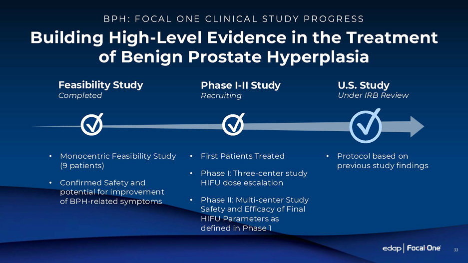 94 Million Global cases of BPH in 2019 (1) 15 Million U.S. men are affected by BPH/LUTS (2) 600,000 U.S. men aged 65+ newly diagnosed annually (3) Leveraging Expertise in Robotic HIFU and Prostate for BPH 12.2 Million men actively managed for BPH/LUTS: • 55% under Drug Management (4) • 35% under Watchful Waiting (4) • 300,000+ Active Surgical Treatments (5) Focal One Robotic HIFU technology has the potential to provide a non - invasive option that can safely treat BPH - related symptoms while avoiding the side effects of standard surgical treatments. 10,000s PCa treatments constitute a robust foundation to build upon for a BPH strategy (1) Fentahun et al. The Lancet Healthy Longevity. 2022 (2) Egan K B. Urologic Clinics of North America. 2016 (3) Urologic Diseases in America. 2024. National Institutes of Health, National Institute of Diabetes and Digestive and Kidney Diseases. 2024 (4) Vuichoud et al. Can J Urol. 2015 (5) Internal market estimate B E N I G N P R O S T A T I C H Y P E R P L A S I A ( B P H ) M A R K E T 32