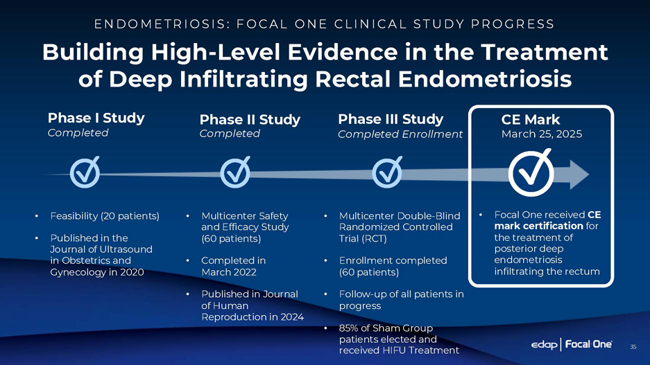 6.5 Million US Women Have Endometriosis (1) 1.3 Million 20% of Cases are Deep Infiltrating Endometriosis (DIE) in the U.S. (2) 11% of U.S. Women are Affected by Endometriosis (2) Leveraging Expertise in Robotic HIFU For Endometriosis Common symptoms of Rectal Endometriosis may include various conditions (acute pelvic pain, constipation, diarrhea, rectal bleeding), all of which negatively impact quality of life and ability to become pregnant. Current treatment options are lacking and limited to hormonal and/or surgical management Focal One has the potential of offering a non - invasive option with the ability of Reducing Symptoms and Improving Quality of Life (1) Office of Women’s Health ( www.womenshealth.gov) (2 ) D'Alterio MN et al. Management Challenges of Deep Infiltrating Endometriosis. Int J Fertil Steril. 2021 Apr;15 (2):88 - 94. doi: 10.22074 /IJFS.202 0.134689. Epub 2021 Mar 11. PMID: 33687160; PMCID: PMC8052801 U . S . 34 E N D O M E T R I O S I S M A R K E T