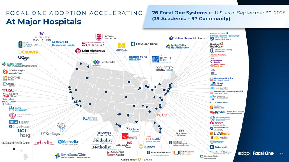 F O C A L O N E A DO P T I O N A C C E L E R A T I N G At Major Hospitals 76 Focal One Systems in U.S. as of September 30, 2025 (39 Academic – 37 Community) 37