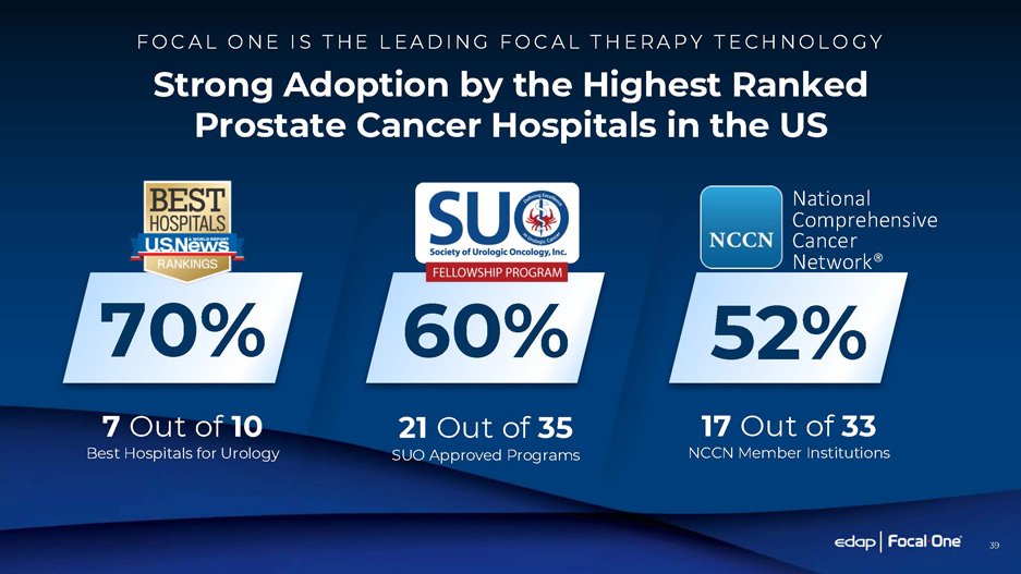Strong Adoption by the Highest Ranked Prostate Cancer Hospitals in the US F O C A L O N E I S T HE L E A D I N G F O C A L T H E R A P Y T E C H N O L O G Y 70% 7 Out of 10 Best Hospitals for Urology National Comprehensive Cancer Network® 52% 17 Out of 33 NCCN Member Institutions 60% 21 Out of 35 SUO Approved Programs 39