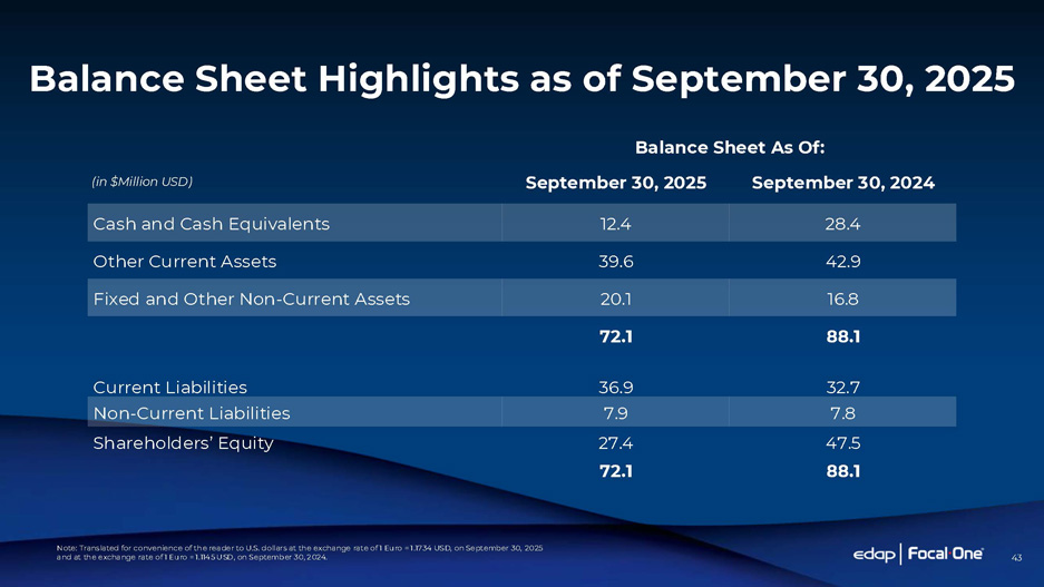 N I N E M O N T HS E N D E D S E P T E M B E R 3 0 T H 2025 2024 (in $Million USD except per share data) 48.8 47.6 Revenue 20.7 19.0 Gross Profit 42.5% 39.9% Gross Margin (18.7) (18.2) Operating Profit (Loss) (19.8) (18.5) Net Income (Loss) (0.53) (0.50) Earnings (Loss) Per Share HIFU $16.3M HIFU $23.9M +46% Distribution $19.1M - 21% Distribution $24.1M ESWL $5.7M - 20% ESWL $7.1M 9 months 2024 9 months 2025 $ 4 7 . 6 M NOTE: Translated for convenience of the reader to U.S. dollars at the 2025 average nine months’ exchange rate of 1 Euro = 1.1213 USD, and 2024 average nine months’ exchange rate of 1 Euro = 1.0858 USD 42 $ 4 8 . 8 M Financial Highlights as of September 30, 2025