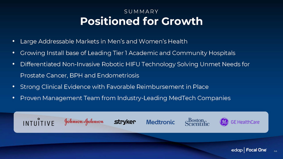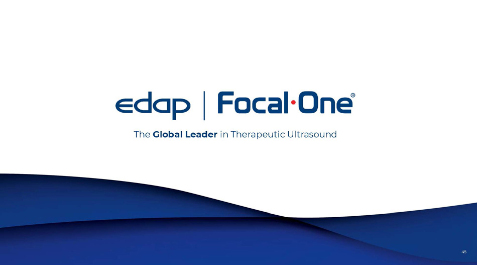 Positioned for Growth S U M M A R Y • Large Addressable Markets in Men’s and Women’s Health • Growing Install base of Leading Tier 1 Academic and Community Hospitals • Differentiated Non - Invasive Robotic HIFU Technology Solving Unmet Needs for Prostate Cancer, BPH and Endometriosis • Strong Clinical Evidence with Favorable Reimbursement in Place • Proven Management Team from Industry - Leading MedTech Companies 44