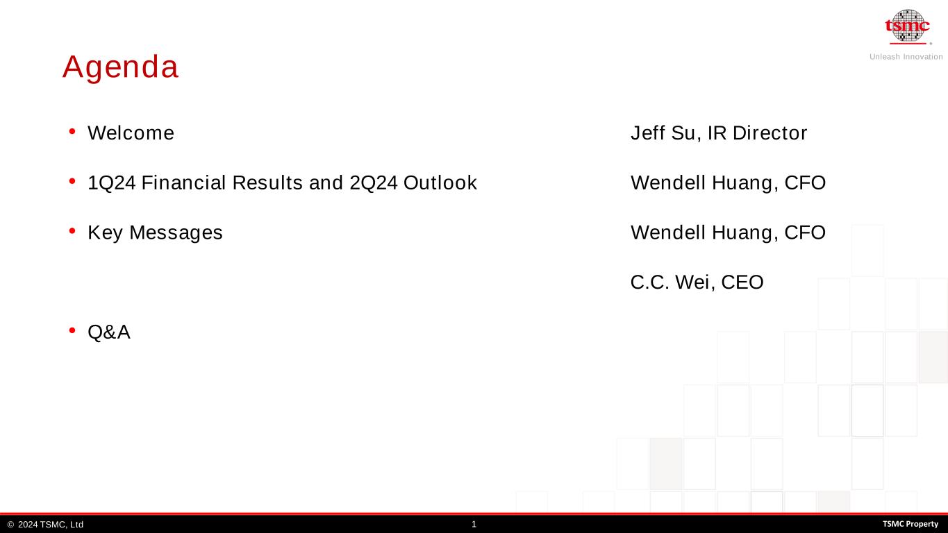 Unleash Innovation TSMC, Ltd© 12024 TSMC Property Agenda • Welcome Jeff Su, IR Director • 1Q24 Financial Results and 2Q24 Outlook Wendell Huang, CFO • Key Messages Wendell Huang, CFO C.C. Wei, CEO • Q&A