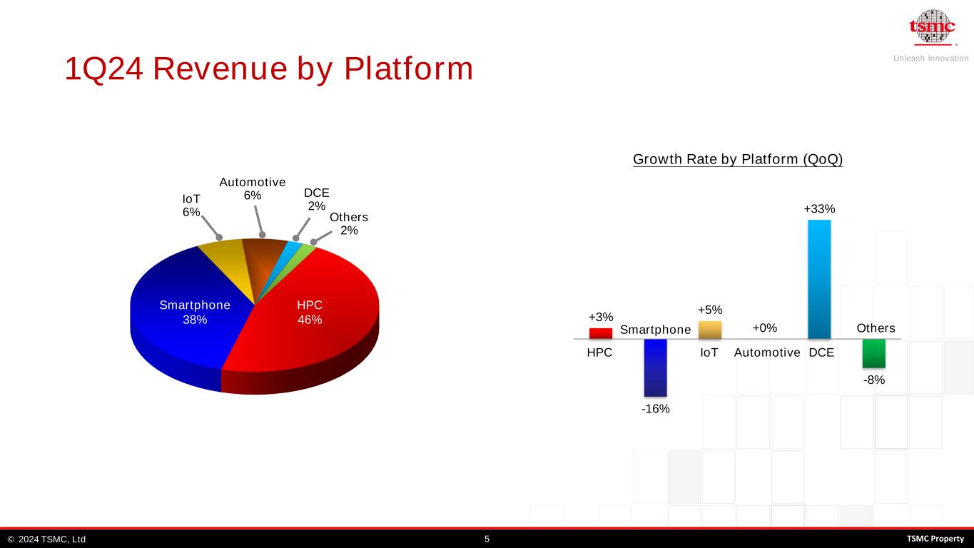 Unleash Innovation TSMC, Ltd© 42024 TSMC Property - 50 100 150 200 250 300 350 400 R e v e n u e ( N T $ B ) 7nm 5nm 3nm 1Q24 Revenue by Technology 7nm and Below Revenue 0.11/0.13um 3% 90nm 1% 0.25um and above 1% 40/45nm 5% 28nm 8% 16nm 9% 0.15/0.18um 4% 65nm 4% 7nm 19% 5nm 37% 3nm 9%