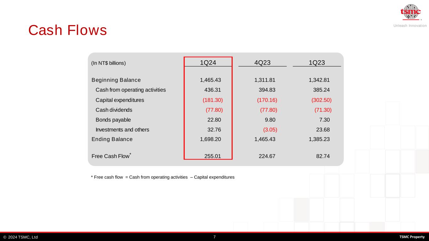 Unleash Innovation TSMC, Ltd© 62024 TSMC Property Balance Sheets & Key Indices Selected Items from Balance Sheets (In NT$ b illions) Amount % Amount % Amount % Cash & Marketable Securities 1,922.66 33.2% 1,687.65 30.5% 1,589.19 31.6% Accounts Receivable 201.98 3.5% 201.94 3.7% 148.05 2.9% Inventories 267.12 4.6% 250.99 4.5% 216.07 4.3% Long-term Investments 138.47 2.4% 129.44 2.3% 69.91 1.4% Net PP&E 3,051.85 52.7% 3,064.48 55.4% 2,833.40 56.1% Total Assets 5,787.89 100.0% 5,532.37 100.0% 5,045.84 100.0% Current Liabilities 1,026.18 17.7% 913.58 16.5% 873.09 17.3% Long-term Interest-bearing Debts 965.56 16.7% 918.28 16.6% 854.79 16.9% Total Liabilities 2,122.18 36.7% 2,049.11 37.0% 1,952.95 38.7% Total Shareholders' Equity 3,665.71 63.3% 3,483.26 63.0% 3,092.89 61.3% Key Indices A/R Turnover Days Inventory Turnover Days Current Ratio (x) Asset Productivity (x) * Total outstanding shares were 25,934mn units at 3/31/24 ** Asset productivity = Annualized net revenue / Average net PP&E 2.4 2.4 2.3 0.8 0.8 0.7 90 1Q24 4Q23 1Q23 31 31 34 85 96