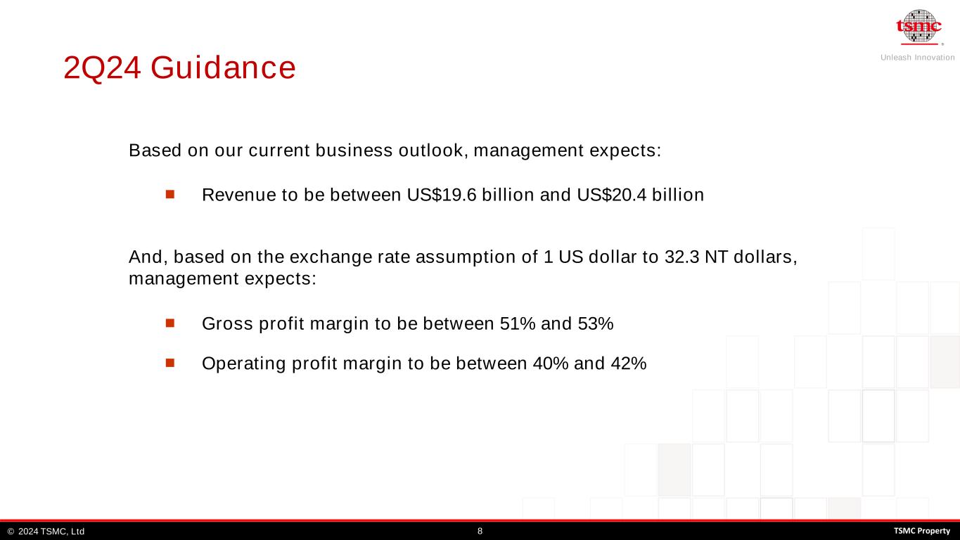 Unleash Innovation TSMC, Ltd© 82024 TSMC Property 2Q24 Guidance ◼ Revenue to be between US$19.6 billion and US$20.4 billion Based on our current business outlook, management expects: And, based on the exchange rate assumption of 1 US dollar to 32.3 NT dollars, management expects: ◼ Gross profit margin to be between 51% and 53% ◼ Operating profit margin to be between 40% and 42%
