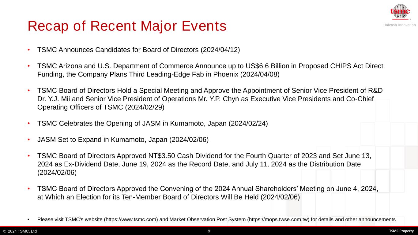 Unleash Innovation TSMC, Ltd© 92024 TSMC Property • Please visit TSMC's website (https://www.tsmc.com) and Market Observation Post System (https://mops.twse.com.tw) for details and other announcements • TSMC Announces Candidates for Board of Directors (2024/04/12) • TSMC Arizona and U.S. Department of Commerce Announce up to US$6.6 Billion in Proposed CHIPS Act Direct Funding, the Company Plans Third Leading-Edge Fab in Phoenix (2024/04/08) • TSMC Board of Directors Hold a Special Meeting and Approve the Appointment of Senior Vice President of R&D Dr. Y.J. Mii and Senior Vice President of Operations Mr. Y.P. Chyn as Executive Vice Presidents and Co-Chief Operating Officers of TSMC (2024/02/29) • TSMC Celebrates the Opening of JASM in Kumamoto, Japan (2024/02/24) • JASM Set to Expand in Kumamoto, Japan (2024/02/06) • TSMC Board of Directors Approved NT$3.50 Cash Dividend for the Fourth Quarter of 2023 and Set June 13, 2024 as Ex-Dividend Date, June 19, 2024 as the Record Date, and July 11, 2024 as the Distribution Date (2024/02/06) • TSMC Board of Directors Approved the Convening of the 2024 Annual Shareholders’ Meeting on June 4, 2024, at Which an Election for its Ten-Member Board of Directors Will Be Held (2024/02/06) Recap of Recent Major Events