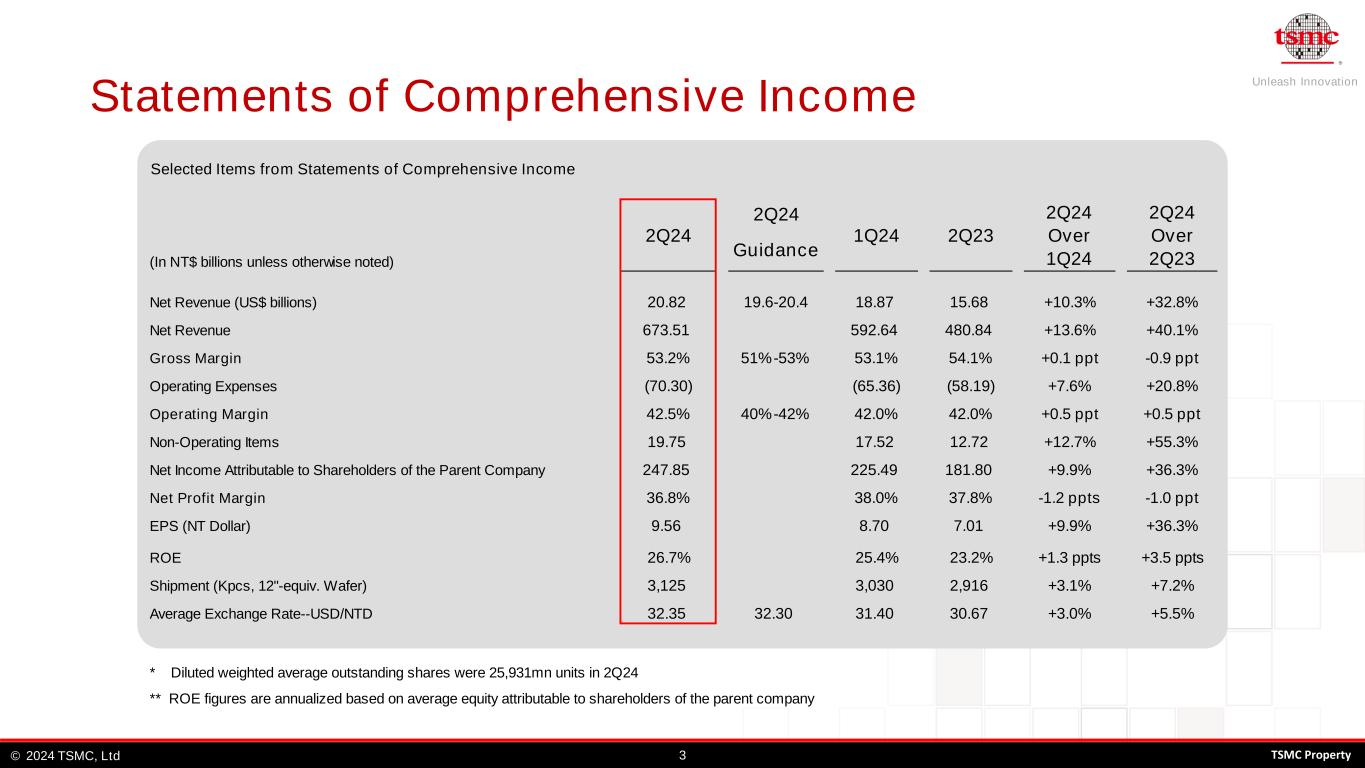 Unleash Innovation TSMC, Ltd© 22024 TSMC Property Safe Harbor Notice • TSMC’s statements of its current expectations are forward-looking statements subject to significant risks and uncertainties and actual results may differ materially from those contained in the forward-looking statements. • Information as to those factors that could cause actual results to vary can be found in TSMC’s 2023 Annual Report on Form 20-F filed with the United States Securities and Exchange Commission (the “SEC”) on April 18, 2024 and such other documents as TSMC may file with, or submit to, the SEC from time to time. • Except as required by law, we undertake no obligation to update any forward-looking statement, whether as a result of new information, future events, or otherwise.
