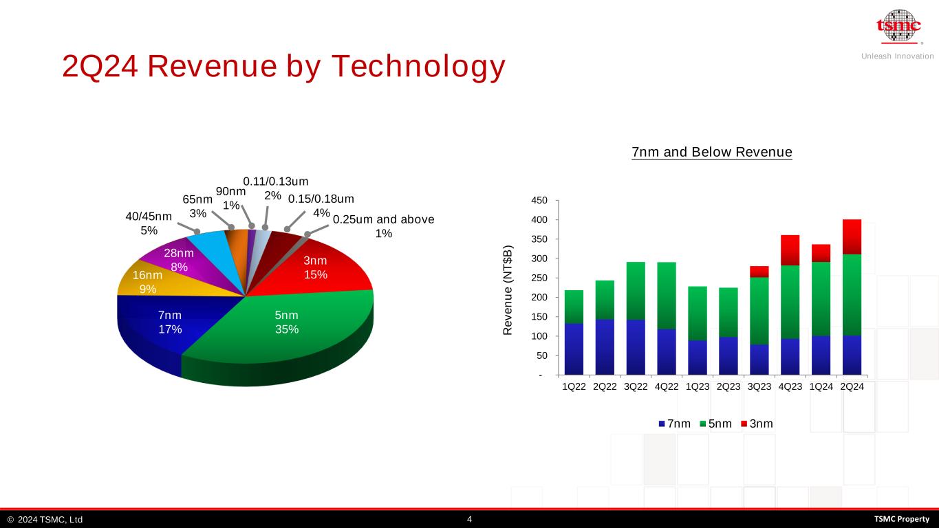 Unleash Innovation TSMC, Ltd© 32024 TSMC Property Statements of Comprehensive Income Selected Items from Statements of Comprehensive Income 2Q24 (In NT$ billions unless otherwise noted) Guidance Net Revenue (US$ billions) 20.82 19.6-20.4 18.87 15.68 +10.3% +32.8% Net Revenue 673.51 592.64 480.84 +13.6% +40.1% Gross Margin 53.2% 51%-53% 53.1% 54.1% +0.1 ppt -0.9 ppt Operating Expenses (70.30) (65.36) (58.19) +7.6% +20.8% Operating Margin 42.5% 40%-42% 42.0% 42.0% +0.5 ppt +0.5 ppt Non-Operating Items 19.75 17.52 12.72 +12.7% +55.3% Net Income Attributable to Shareholders of the Parent Company 247.85 225.49 181.80 +9.9% +36.3% Net Profit Margin 36.8% 38.0% 37.8% -1.2 ppts -1.0 ppt EPS (NT Dollar) 9.56 8.70 7.01 +9.9% +36.3% ROE 26.7% 25.4% 23.2% +1.3 ppts +3.5 ppts Shipment (Kpcs, 12"-equiv. Wafer) 3,125 3,030 2,916 +3.1% +7.2% Average Exchange Rate--USD/NTD 32.35 32.30 31.40 30.67 +3.0% +5.5% * Diluted weighted average outstanding shares were 25,931mn units in 2Q24 ** ROE figures are annualized based on average equity attributable to shareholders of the parent company 2Q24 1Q24 2Q23 2Q24 Over 1Q24 2Q24 Over 2Q23