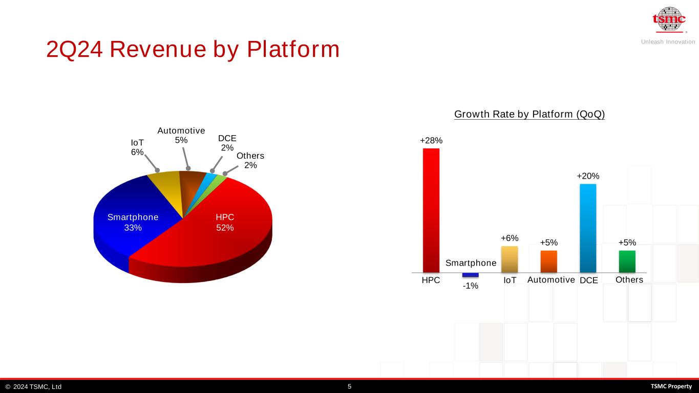 Unleash Innovation TSMC, Ltd© 42024 TSMC Property - 50 100 150 200 250 300 350 400 450 1Q22 2Q22 3Q22 4Q22 1Q23 2Q23 3Q23 4Q23 1Q24 2Q24 R e v e n u e ( N T $ B ) 7nm 5nm 3nm 2Q24 Revenue by Technology 7nm and Below Revenue 0.11/0.13um 2%90nm 1% 0.25um and above 1% 40/45nm 5% 28nm 8% 16nm 9% 0.15/0.18um 4% 65nm 3% 7nm 17% 5nm 35% 3nm 15%