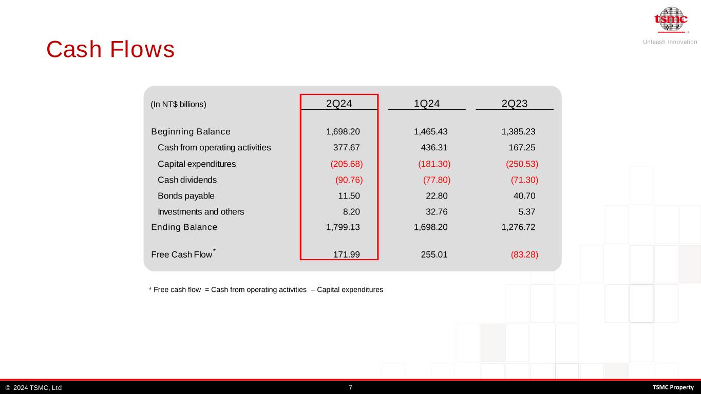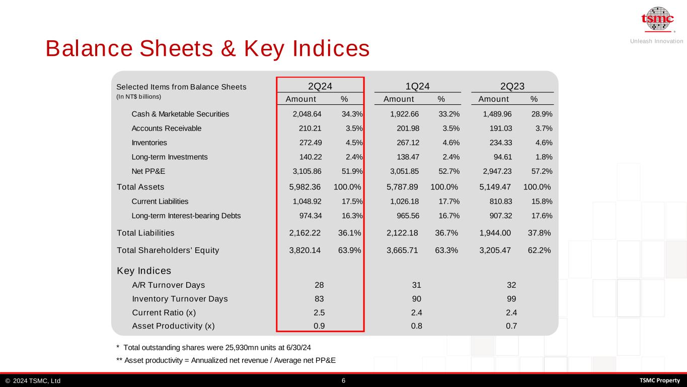 Unleash Innovation TSMC, Ltd© 62024 TSMC Property Balance Sheets & Key Indices Selected Items from Balance Sheets (In NT$ b illions) Amount % Amount % Amount % Cash & Marketable Securities 2,048.64 34.3% 1,922.66 33.2% 1,489.96 28.9% Accounts Receivable 210.21 3.5% 201.98 3.5% 191.03 3.7% Inventories 272.49 4.5% 267.12 4.6% 234.33 4.6% Long-term Investments 140.22 2.4% 138.47 2.4% 94.61 1.8% Net PP&E 3,105.86 51.9% 3,051.85 52.7% 2,947.23 57.2% Total Assets 5,982.36 100.0% 5,787.89 100.0% 5,149.47 100.0% Current Liabilities 1,048.92 17.5% 1,026.18 17.7% 810.83 15.8% Long-term Interest-bearing Debts 974.34 16.3% 965.56 16.7% 907.32 17.6% Total Liabilities 2,162.22 36.1% 2,122.18 36.7% 1,944.00 37.8% Total Shareholders' Equity 3,820.14 63.9% 3,665.71 63.3% 3,205.47 62.2% Key Indices A/R Turnover Days Inventory Turnover Days Current Ratio (x) Asset Productivity (x) * Total outstanding shares were 25,930mn units at 6/30/24 ** Asset productivity = Annualized net revenue / Average net PP&E 83 2Q24 1Q24 2Q23 28 31 32 90 99 2.5 2.4 2.4 0.9 0.8 0.7