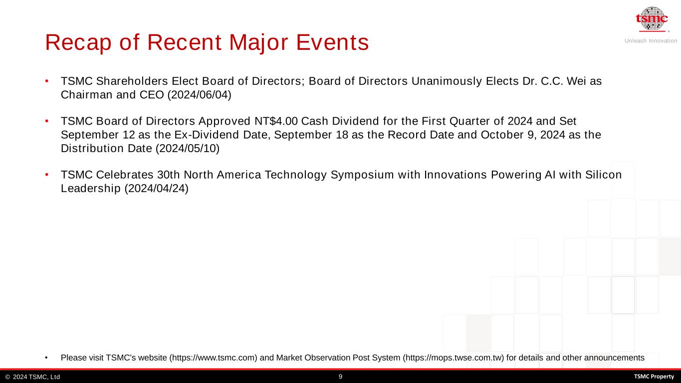 Unleash Innovation TSMC, Ltd© 92024 TSMC Property • Please visit TSMC's website (https://www.tsmc.com) and Market Observation Post System (https://mops.twse.com.tw) for details and other announcements • TSMC Shareholders Elect Board of Directors; Board of Directors Unanimously Elects Dr. C.C. Wei as Chairman and CEO (2024/06/04) • TSMC Board of Directors Approved NT$4.00 Cash Dividend for the First Quarter of 2024 and Set September 12 as the Ex-Dividend Date, September 18 as the Record Date and October 9, 2024 as the Distribution Date (2024/05/10) • TSMC Celebrates 30th North America Technology Symposium with Innovations Powering AI with Silicon Leadership (2024/04/24) Recap of Recent Major Events
