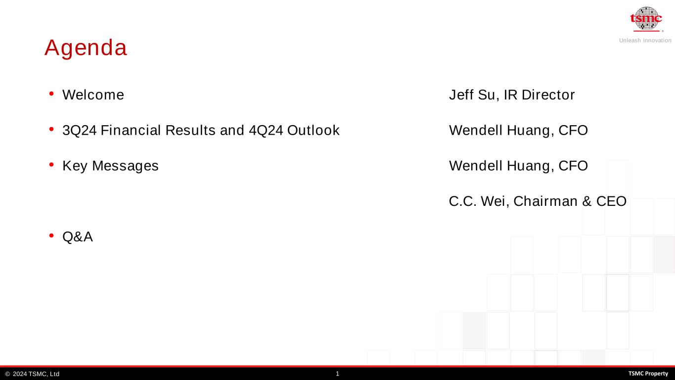 Unleash Innovation TSMC, Ltd© 12024 TSMC Property Agenda • Welcome Jeff Su, IR Director • 3Q24 Financial Results and 4Q24 Outlook Wendell Huang, CFO • Key Messages Wendell Huang, CFO C.C. Wei, Chairman & CEO • Q&A