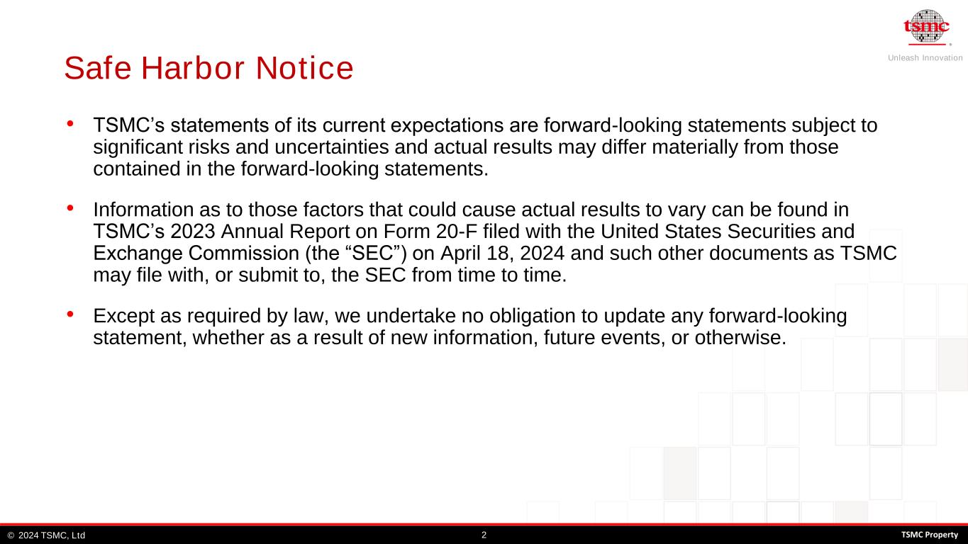 Unleash Innovation TSMC, Ltd© 22024 TSMC Property Safe Harbor Notice • TSMC’s statements of its current expectations are forward-looking statements subject to significant risks and uncertainties and actual results may differ materially from those contained in the forward-looking statements. • Information as to those factors that could cause actual results to vary can be found in TSMC’s 2023 Annual Report on Form 20-F filed with the United States Securities and Exchange Commission (the “SEC”) on April 18, 2024 and such other documents as TSMC may file with, or submit to, the SEC from time to time. • Except as required by law, we undertake no obligation to update any forward-looking statement, whether as a result of new information, future events, or otherwise.