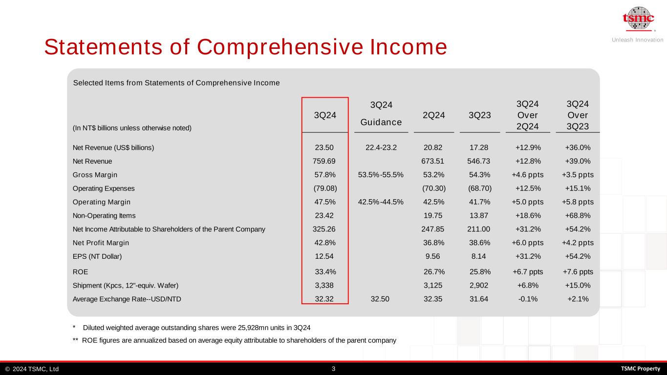 Unleash Innovation TSMC, Ltd© 32024 TSMC Property Selected Items from Statements of Comprehensive Income 3Q24 (In NT$ billions unless otherwise noted) Guidance Net Revenue (US$ billions) 23.50 22.4-23.2 20.82 17.28 +12.9% +36.0% Net Revenue 759.69 673.51 546.73 +12.8% +39.0% Gross Margin 57.8% 53.5%-55.5% 53.2% 54.3% +4.6 ppts +3.5 ppts Operating Expenses (79.08) (70.30) (68.70) +12.5% +15.1% Operating Margin 47.5% 42.5%-44.5% 42.5% 41.7% +5.0 ppts +5.8 ppts Non-Operating Items 23.42 19.75 13.87 +18.6% +68.8% Net Income Attributable to Shareholders of the Parent Company 325.26 247.85 211.00 +31.2% +54.2% Net Profit Margin 42.8% 36.8% 38.6% +6.0 ppts +4.2 ppts EPS (NT Dollar) 12.54 9.56 8.14 +31.2% +54.2% ROE 33.4% 26.7% 25.8% +6.7 ppts +7.6 ppts Shipment (Kpcs, 12"-equiv. Wafer) 3,338 3,125 2,902 +6.8% +15.0% Average Exchange Rate--USD/NTD 32.32 32.50 32.35 31.64 -0.1% +2.1% * Diluted weighted average outstanding shares were 25,928mn units in 3Q24 ** ROE figures are annualized based on average equity attributable to shareholders of the parent company 3Q24 2Q24 3Q23 3Q24 Over 2Q24 3Q24 Over 3Q23 Statements of Comprehensive Income