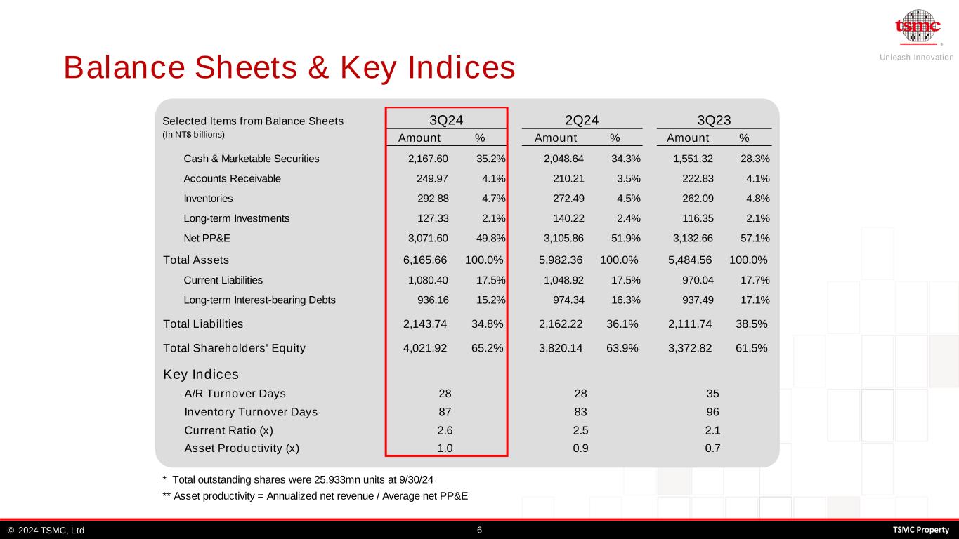 Unleash Innovation TSMC, Ltd© 62024 TSMC Property Selected Items from Balance Sheets (In NT$ b illions) Amount % Amount % Amount % Cash & Marketable Securities 2,167.60 35.2% 2,048.64 34.3% 1,551.32 28.3% Accounts Receivable 249.97 4.1% 210.21 3.5% 222.83 4.1% Inventories 292.88 4.7% 272.49 4.5% 262.09 4.8% Long-term Investments 127.33 2.1% 140.22 2.4% 116.35 2.1% Net PP&E 3,071.60 49.8% 3,105.86 51.9% 3,132.66 57.1% Total Assets 6,165.66 100.0% 5,982.36 100.0% 5,484.56 100.0% Current Liabilities 1,080.40 17.5% 1,048.92 17.5% 970.04 17.7% Long-term Interest-bearing Debts 936.16 15.2% 974.34 16.3% 937.49 17.1% Total Liabilities 2,143.74 34.8% 2,162.22 36.1% 2,111.74 38.5% Total Shareholders' Equity 4,021.92 65.2% 3,820.14 63.9% 3,372.82 61.5% Key Indices A/R Turnover Days Inventory Turnover Days Current Ratio (x) Asset Productivity (x) * Total outstanding shares were 25,933mn units at 9/30/24 ** Asset productivity = Annualized net revenue / Average net PP&E 2.6 2.5 2.1 1.0 0.9 0.7 87 3Q24 2Q24 3Q23 28 28 35 83 96 Balance Sheets & Key Indices