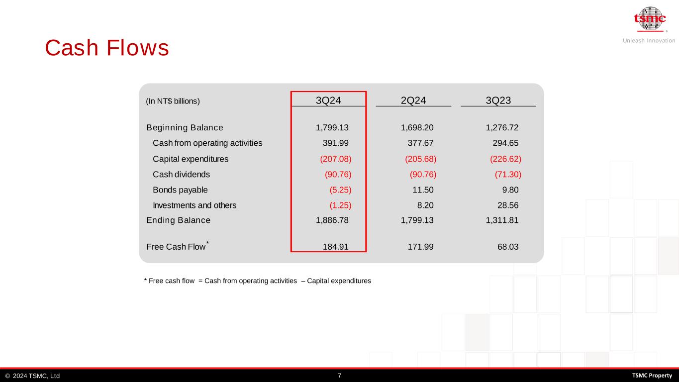 Unleash Innovation TSMC, Ltd© 72024 TSMC Property (In NT$ billions) 3Q24 2Q24 3Q23 Beginning Balance 1,799.13 1,698.20 1,276.72 Cash from operating activities 391.99 377.67 294.65 Capital expenditures (207.08) (205.68) (226.62) Cash dividends (90.76) (90.76) (71.30) Bonds payable (5.25) 11.50 9.80 Investments and others (1.25) 8.20 28.56 Ending Balance 1,886.78 1,799.13 1,311.81 Free Cash Flow 184.91 171.99 68.03 Cash Flows * Free cash flow = Cash from operating activities – Capital expenditures *