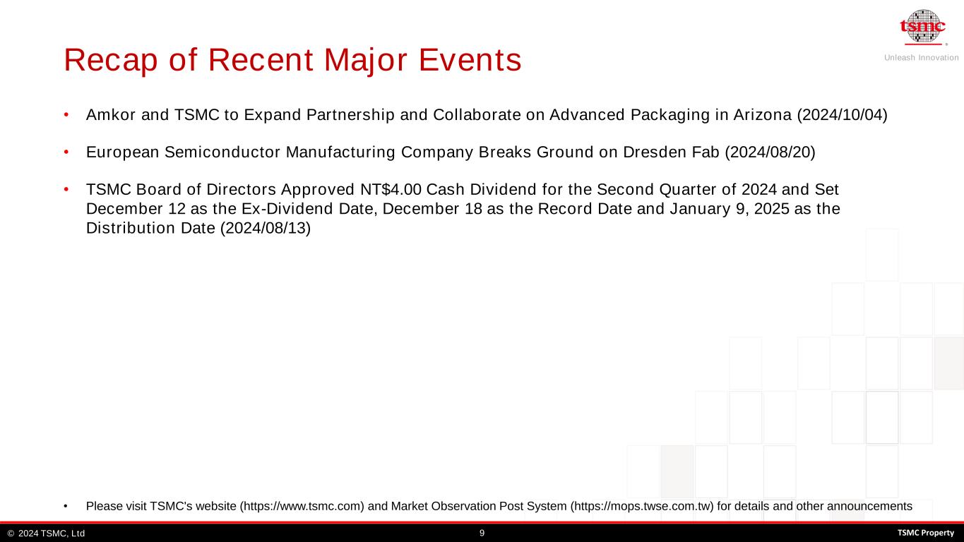 Unleash Innovation TSMC, Ltd© 92024 TSMC Property • Please visit TSMC's website (https://www.tsmc.com) and Market Observation Post System (https://mops.twse.com.tw) for details and other announcements • Amkor and TSMC to Expand Partnership and Collaborate on Advanced Packaging in Arizona (2024/10/04) • European Semiconductor Manufacturing Company Breaks Ground on Dresden Fab (2024/08/20) • TSMC Board of Directors Approved NT$4.00 Cash Dividend for the Second Quarter of 2024 and Set December 12 as the Ex-Dividend Date, December 18 as the Record Date and January 9, 2025 as the Distribution Date (2024/08/13) Recap of Recent Major Events