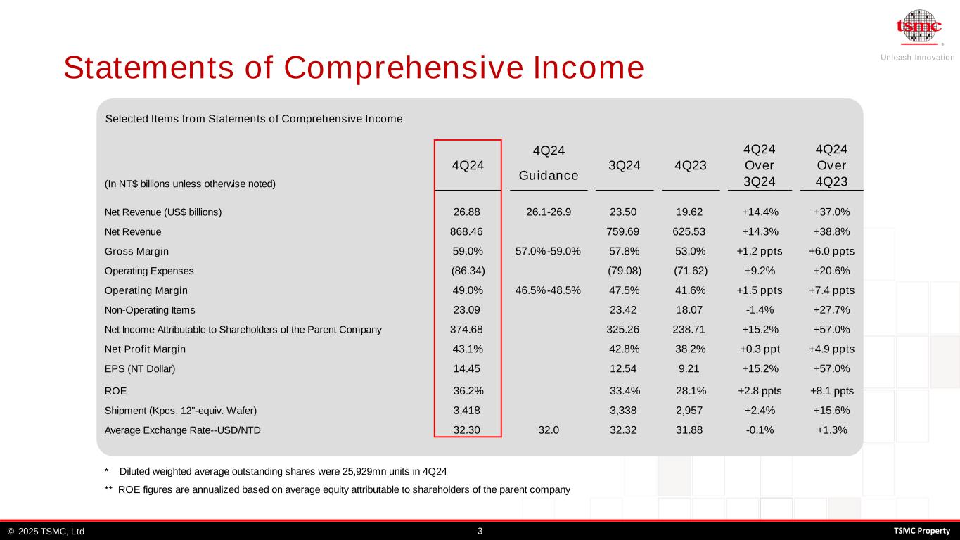Unleash Innovation TSMC, Ltd© 32025 TSMC Property Statements of Comprehensive Income Selected Items from Statements of Comprehensive Income 4Q24 (In NT$ billions unless otherwise noted) Guidance Net Revenue (US$ billions) 26.88 26.1-26.9 23.50 19.62 +14.4% +37.0% Net Revenue 868.46 759.69 625.53 +14.3% +38.8% Gross Margin 59.0% 57.0%-59.0% 57.8% 53.0% +1.2 ppts +6.0 ppts Operating Expenses (86.34) (79.08) (71.62) +9.2% +20.6% Operating Margin 49.0% 46.5%-48.5% 47.5% 41.6% +1.5 ppts +7.4 ppts Non-Operating Items 23.09 23.42 18.07 -1.4% +27.7% Net Income Attributable to Shareholders of the Parent Company 374.68 325.26 238.71 +15.2% +57.0% Net Profit Margin 43.1% 42.8% 38.2% +0.3 ppt +4.9 ppts EPS (NT Dollar) 14.45 12.54 9.21 +15.2% +57.0% ROE 36.2% 33.4% 28.1% +2.8 ppts +8.1 ppts Shipment (Kpcs, 12"-equiv. Wafer) 3,418 3,338 2,957 +2.4% +15.6% Average Exchange Rate--USD/NTD 32.30 32.0 32.32 31.88 -0.1% +1.3% * Diluted weighted average outstanding shares were 25,929mn units in 4Q24 ** ROE figures are annualized based on average equity attributable to shareholders of the parent company 4Q24 3Q24 4Q23 4Q24 Over 3Q24 4Q24 Over 4Q23