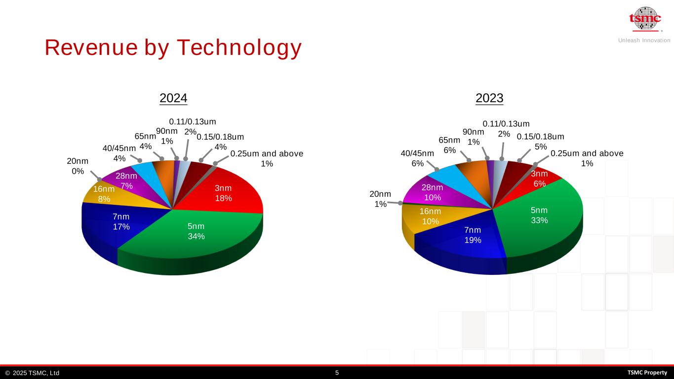 Unleash Innovation TSMC, Ltd© 42025 TSMC Property - 50 100 150 200 250 300 350 400 450 500 550 600 1Q22 2Q22 3Q22 4Q22 1Q23 2Q23 3Q23 4Q23 1Q24 2Q24 3Q24 4Q24 R e v e n u e ( N T $ B ) 7nm 5nm 3nm 4Q24 Revenue by Technology 7nm and Below Revenue 0.11/0.13um 2% 90nm 1% 0.25um and above 0% 40/45nm 3% 28nm 6%16nm 7% 0.15/0.18um 3% 65nm 4% 7nm 14% 5nm 34% 3nm 26%