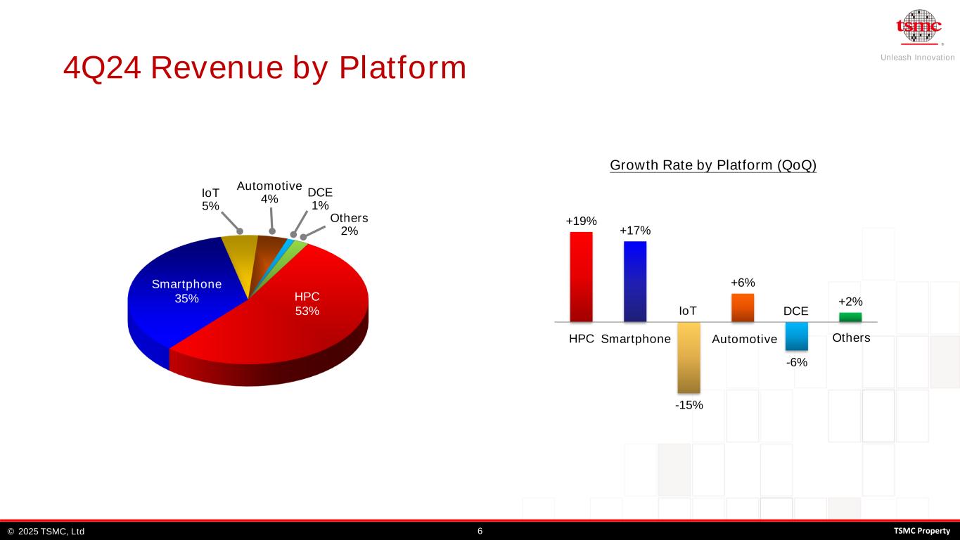 Unleash Innovation TSMC, Ltd© 52025 TSMC Property 0.11/0.13um 2%90nm 1% 0.25um and above 1% 40/45nm 6% 28nm 10% 16nm 10% 0.15/0.18um 5% 65nm 6% 7nm 19% 5nm 33% 3nm 6% 20nm 1% Revenue by Technology 20232024 0.11/0.13um 2%90nm 1% 0.25um and above 1% 40/45nm 4% 28nm 7%16nm 8% 0.15/0.18um 4% 65nm 4% 7nm 17% 5nm 34% 3nm 18% 20nm 0%