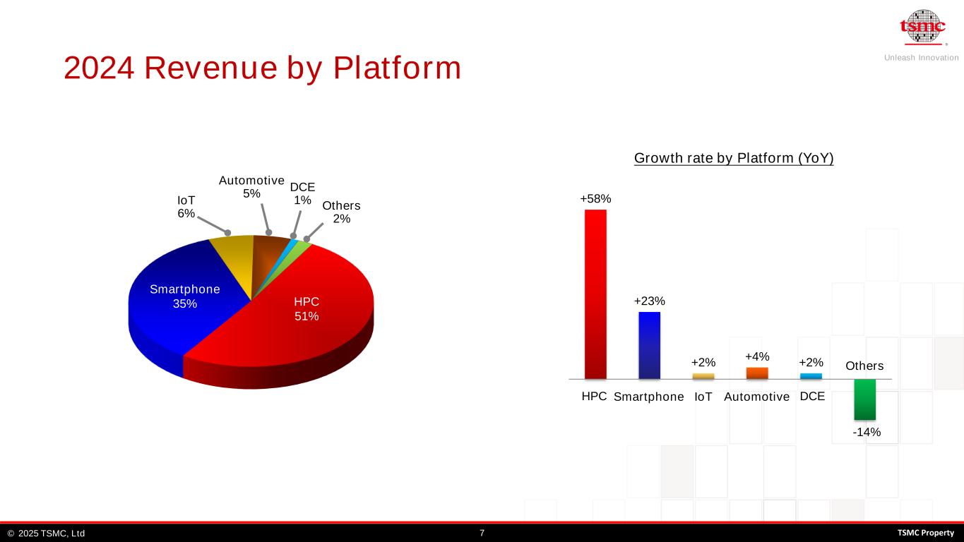 Unleash Innovation TSMC, Ltd© 62025 TSMC Property 4Q24 Revenue by Platform +19% +17% -15% +6% -6% +2% Growth Rate by Platform (QoQ) Automotive 4% DCE 1% Others 2% IoT 5% Smartphone Automotive OthersHPC IoT DCE HPC 53% Smartphone 35%