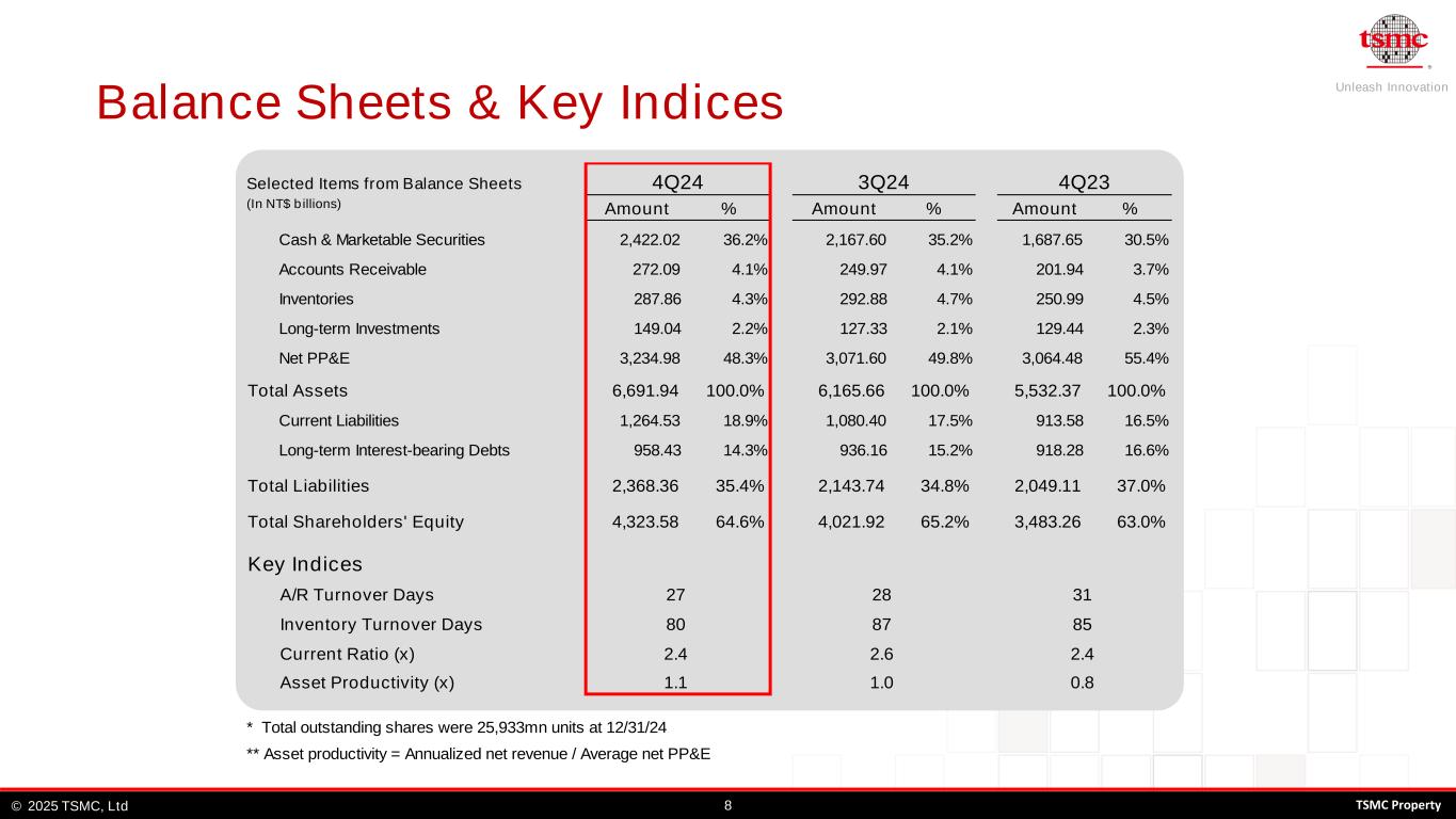 Unleash Innovation TSMC, Ltd© 82025 TSMC Property Balance Sheets & Key Indices Selected Items from Balance Sheets (In NT$ b illions) Amount % Amount % Amount % Cash & Marketable Securities 2,422.02 36.2% 2,167.60 35.2% 1,687.65 30.5% Accounts Receivable 272.09 4.1% 249.97 4.1% 201.94 3.7% Inventories 287.86 4.3% 292.88 4.7% 250.99 4.5% Long-term Investments 149.04 2.2% 127.33 2.1% 129.44 2.3% Net PP&E 3,234.98 48.3% 3,071.60 49.8% 3,064.48 55.4% Total Assets 6,691.94 100.0% 6,165.66 100.0% 5,532.37 100.0% Current Liabilities 1,264.53 18.9% 1,080.40 17.5% 913.58 16.5% Long-term Interest-bearing Debts 958.43 14.3% 936.16 15.2% 918.28 16.6% Total Liabilities 2,368.36 35.4% 2,143.74 34.8% 2,049.11 37.0% Total Shareholders' Equity 4,323.58 64.6% 4,021.92 65.2% 3,483.26 63.0% Key Indices A/R Turnover Days Inventory Turnover Days Current Ratio (x) Asset Productivity (x) * Total outstanding shares were 25,933mn units at 12/31/24 ** Asset productivity = Annualized net revenue / Average net PP&E 80 4Q24 3Q24 4Q23 27 28 31 87 85 2.4 2.6 2.4 1.1 1.0 0.8