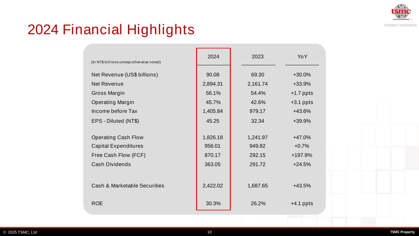 Unleash Innovation TSMC, Ltd© 92025 TSMC Property (In NT$ billions) 4Q24 3Q24 4Q23 Beginning Balance 1,886.78 1,799.13 1,311.81 Cash from operating activities 620.21 391.99 394.83 Capital expenditures (361.95) (207.08) (170.16) Cash dividends (103.73) (90.76) (77.80) Bonds payable (1.75) (5.25) 9.80 Investments and others 88.07 (1.25) (3.05) Ending Balance 2,127.63 1,886.78 1,465.43 Free Cash Flow 258.26 184.91 224.67 Cash Flows * Free cash flow = Cash from operating activities – Capital expenditures *