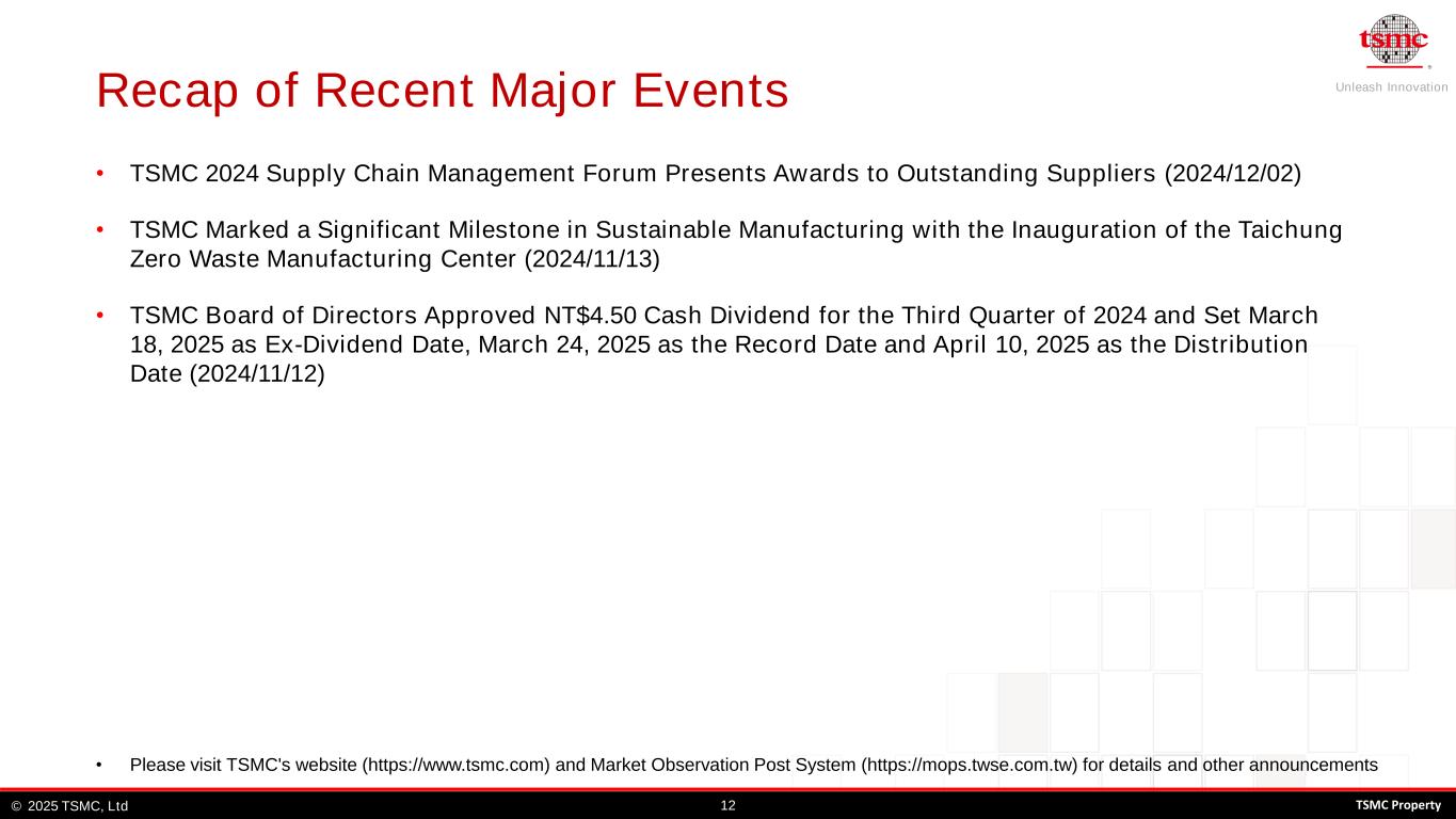 Unleash Innovation TSMC, Ltd© 122025 TSMC Property • Please visit TSMC's website (https://www.tsmc.com) and Market Observation Post System (https://mops.twse.com.tw) for details and other announcements • TSMC 2024 Supply Chain Management Forum Presents Awards to Outstanding Suppliers (2024/12/02) • TSMC Marked a Significant Milestone in Sustainable Manufacturing with the Inauguration of the Taichung Zero Waste Manufacturing Center (2024/11/13) • TSMC Board of Directors Approved NT$4.50 Cash Dividend for the Third Quarter of 2024 and Set March 18, 2025 as Ex-Dividend Date, March 24, 2025 as the Record Date and April 10, 2025 as the Distribution Date (2024/11/12) Recap of Recent Major Events