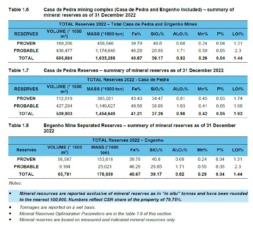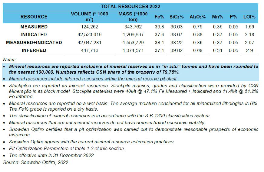 The following tables set forth the total mineral resources and reserves that are attributable to our ownership interest (not consolidating CSN Mineração’s mineral resources and reserves) as of December 31, 2022. The information in the following tables reflects ordinary course depletion as compared to the mineral resources and reserves information as of December 31, 2021 set forth in our 2022 Annual Report.