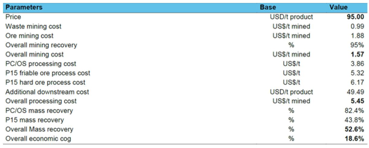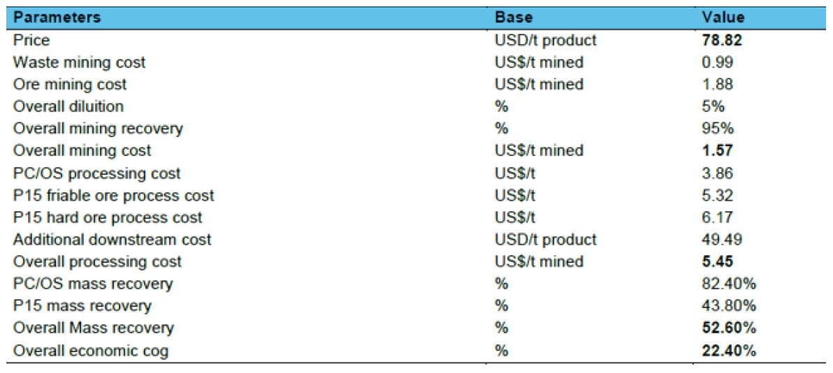 The economic cutoff grade to decide whether a block should be mined or left in-situ was calculated by the NPVS Software of Datamine. We calculate the reserves economic cutoff at 22.40%.