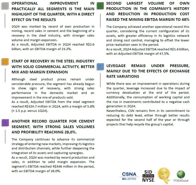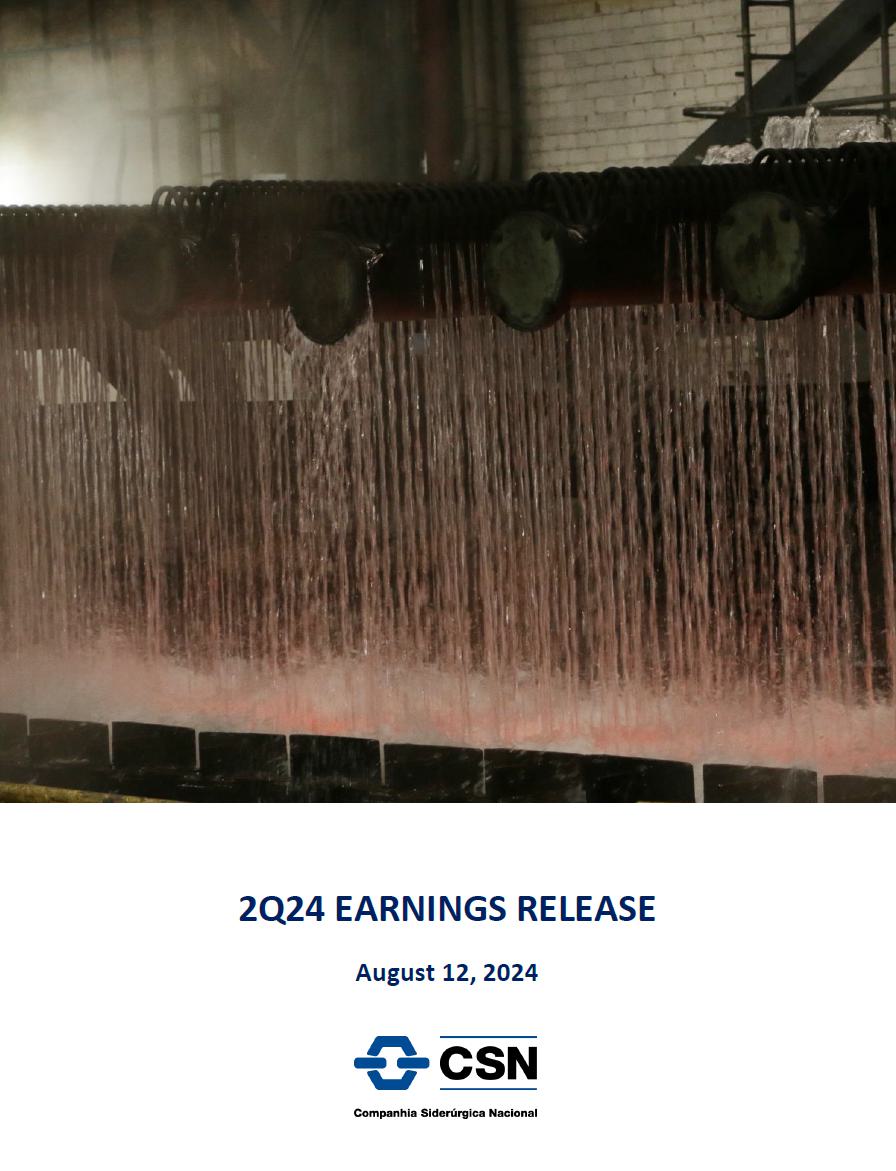 São Paulo, August 12 , 2024 - Companhia Siderúrgica Nacional (“CSN”) (B3: CSNA3) (NYSE: SID) announces its results for the second quarter of 2024 (2Q24) in Reais, with its consolidated financial statements in accordance with the accounting practices adopted in Brazil issued by the Accounting Pronouncements Committee ("CPC"), approved by the Brazilian Securities and Exchange Commission ("CVM") and the Federal Accounting Council ("CFC") and in accordance with the International Financial Reporting Standards ("IFRS") issued by the International Accounting Standards Board ("IASB").