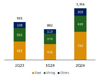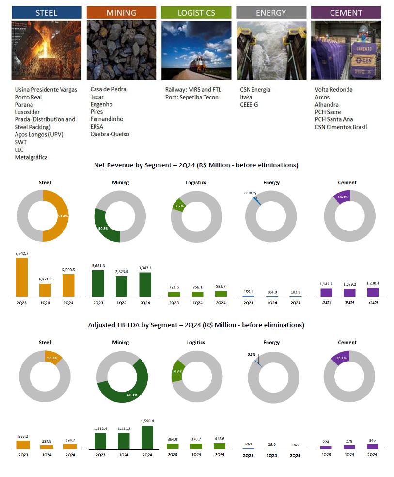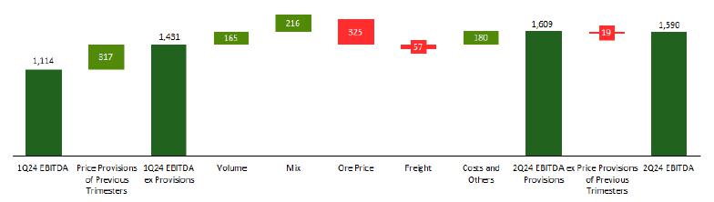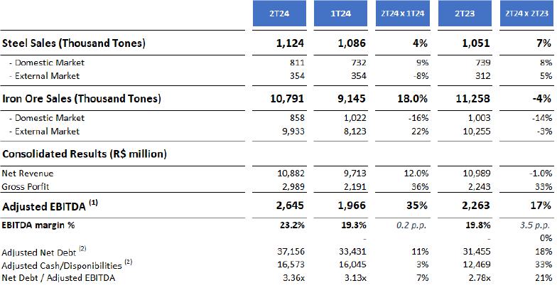 ·Adjusted EBITDA from the Steel Industry reached R$324.7 million in 2Q24, 38.8% higher than in 1Q24, with an Adjusted EBITDA Margin of 5.8%, or 1.5 p.p. above that recorded in the previous quarter. This increase in profitability is an important sign that the segment is gradually regaining its efficiency, with a more positive environment regarding steel demand and prospects for better prices in the coming months.
