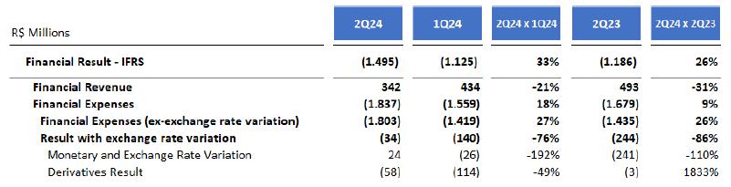 ·In 2Q24, the Financial Result was negative by R$1,495 million, which represents an increase of 33% in relation to 1Q24. This was due to an increase in the cost of debt in dollars, as well as the negative effect of the devaluation of Usiminas shares.