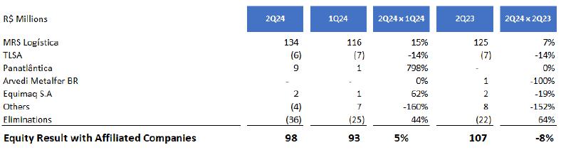·The Equity Result was positive at R$98.0 million in 2Q24, an increase of 5.4% compared to the previous quarter, mainly as a consequence of the excellent performance that MRS has been able to achieve in recent quarters, with an increase in cargo movements.