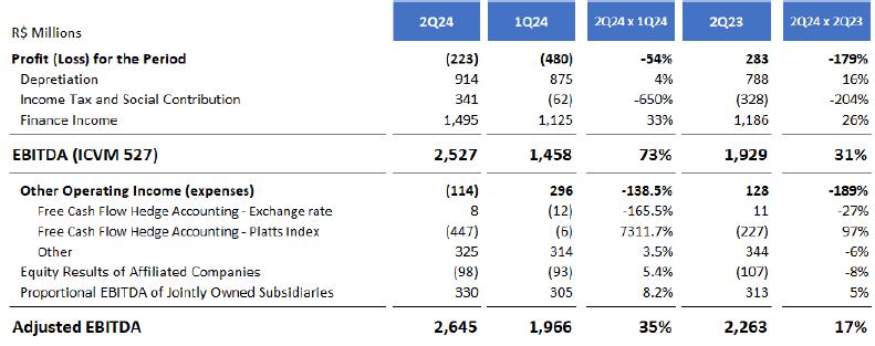 ·         Adjusted EBITDA reached R$1,590,4 million in 2Q24, with a quarterly Adjusted EBITDA margin of 47.5%, which represents an increase of 8.1 p.p. compared to 1Q24. This increase in profitability, even in a period of falling realized prices, is a direct result of the operational excellence achieved by the Company, combining record of own production in the current plant configuration with optimization of the logistics network and cost reduction. In addition, the exchange rate devaluation also had a positive impact on the quarter's results.