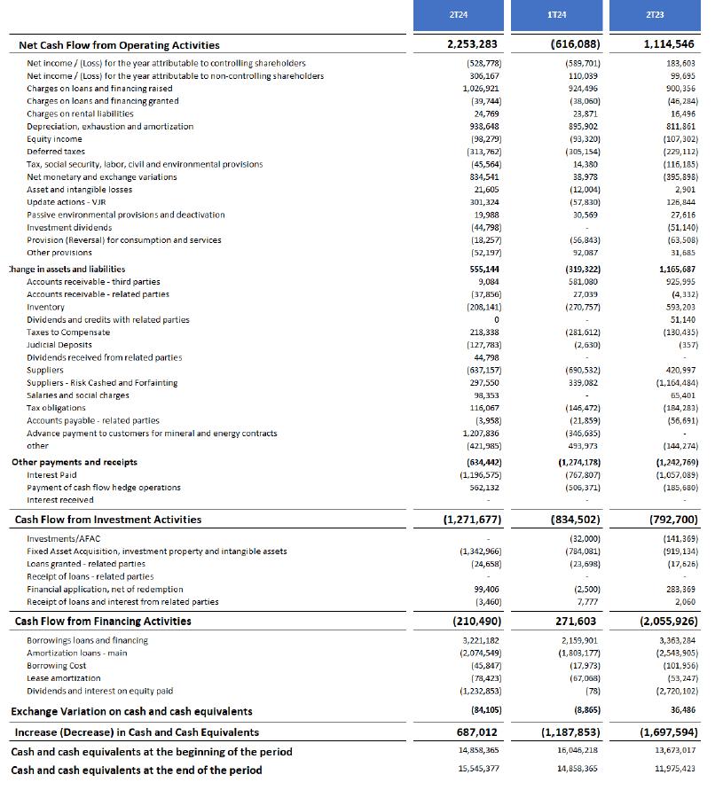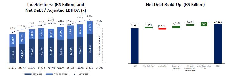 Adjusted Cash Flow in 2Q24 was negative at R$1,164.0 million. This was due to consumption of working capital, in addition to the higher volume of investments made in the period and the impact of the exchange rate variation on the financial result. This had the effect of more than offsetting the stronger operating result recorded in the quarter.