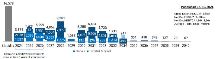 CSN remains very active in its objective of extending the amortization term, focusing on long-term operations and the local capital market. Among the main movements in 2Q24, the Company made the payment of principal and interest amortizations on debts that would have matured in 2024, 2025 and 2026.