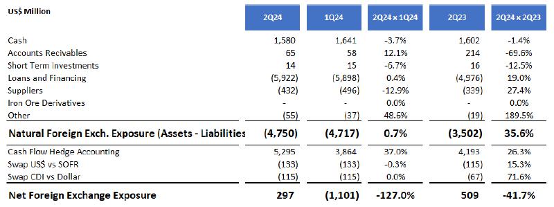 The net foreign exchange exposure in the 2Q24 consolidated balance sheet was US$297.0 million, as shown in the table below. This is in line with the company's policy of minimizing exchange rate volatility and its impact on results. CSN's hedge accounting strategy aligns the projected flow of exports in dollars with future debt maturities in the same currency. Consequently, the fluctuations in the value of the dollar-denominated debt are recorded as a temporary adjustment to shareholders' equity and are subsequently reflected in the income statement when the dollar revenues from these exports are recognized.