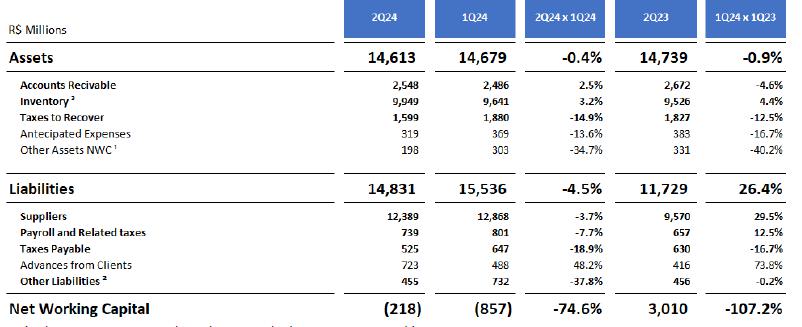 Net working capital applied to the business was negative at R$218.0 million in 2Q24, a 74.6% decrease from 1Q24. This is mainly due to a reduction in suppliers and labor obligations, as well as an increase in accounts receivable.