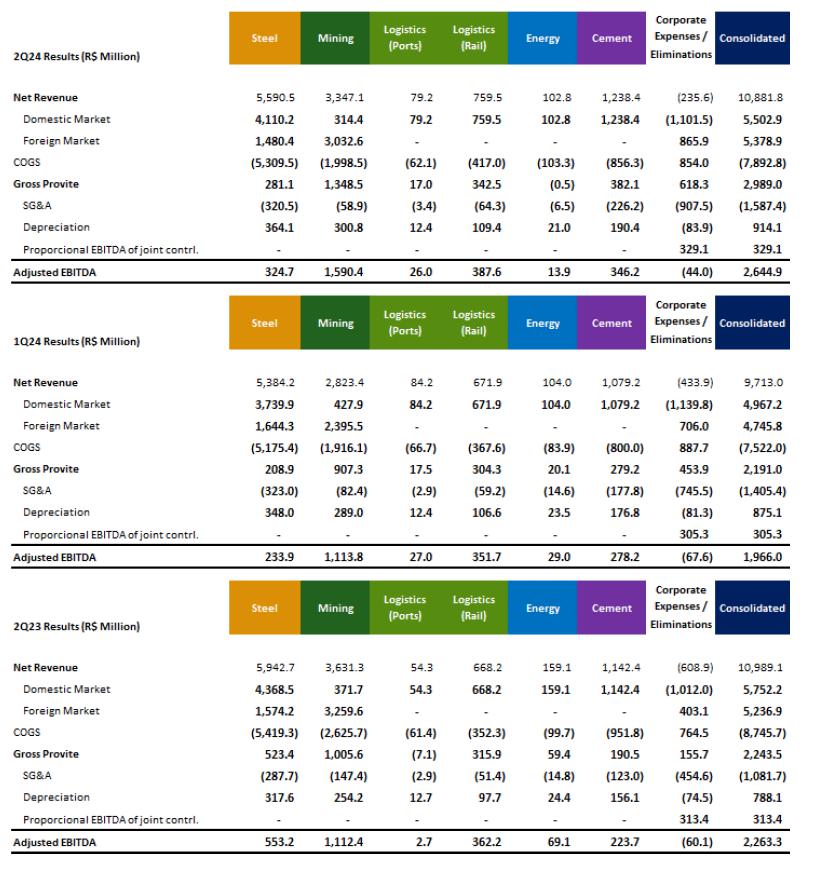 ·Net Revenue totaled R$10,881.7 million in 2Q24, representing a 12.0% growth compared to 1Q24, as a result of the improved performance of the steel segment, in addition to the positive effect of the period's seasonality, which provided greater production and commercial activity for both mining and cement. Among the main operational highlights in the period, we had record sales in the cement segment and the second largest volume of iron ore ever produced in the Company's history (own production).