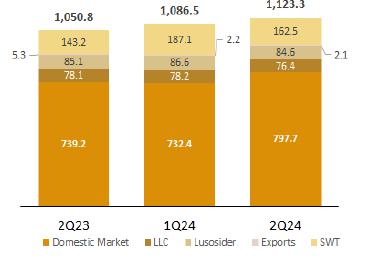 Total Sales in 2Q24 reached 1,122.6 thousand tons, representing a 3.3% increase over the first quarter and a 6.8% increase over the same period in 2023. This marks the first time since 3Q22 that CSN's sales have exceeded 1.1 million tons, indicating not only a normalization of operations but also greater dynamism in the local market.