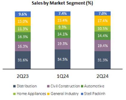 In terms of total sales volume, the General Industry segment was the main highlight in 2Q24, with a 2.1 p.p. increase compared to the volume sold in the previous quarter, reaching 17.4% of total volume. Conversely, Distribution (31.3%) experienced the greatest decline in sales volume due to seasonal factors and heightened commercial activity in other segments. When compared on a year-over-year basis, notable recoveries were observed in Construction and General Industry, while declines were seen in Packaging, Auto sector, White Goods, and Distribution.