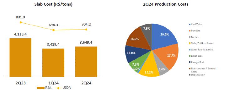 ·         The Slab Cost in 2Q24 reached R$3,549.4/t, an increase of 3.8% compared to the previous quarter. This was due to a lower dilution of fixed costs resulting from scheduled stoppages, coupled with an increase in the average exchange rate in the period. However, when compared to the same period last year, we can see a 13.7% reduction in slab cost, which reflects the gradual normalization of the production process.