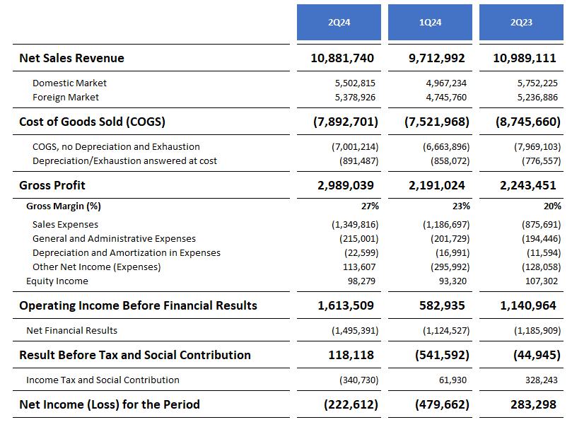 ·Gross profit in the 2Q24 reached R $3.0 billion, with a gross margin of 27.6%, which represents an increase of 5.0 p.p. in comparison to the first quarter of 2024 and reflects the operational improvement seen in the Company's main operating segments.