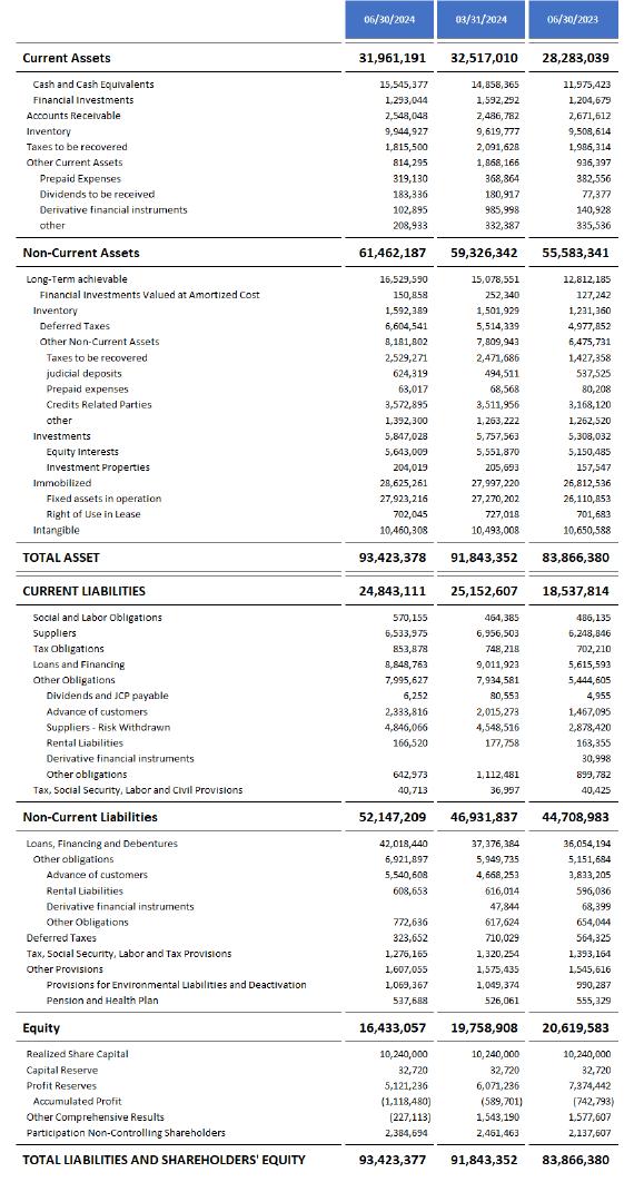 The comments address the Company's consolidated results for the second quarter of 2024 (2Q24) and the comparisons are for the first quarter of 2024 (1Q24) and the second quarter of 2023 (2Q23). The dollar exchange rate was R$ 4.82 on 06/30/2023; R$ 4.99 on 03/31/2023 and R$ 5.59 on 06/30/2024.