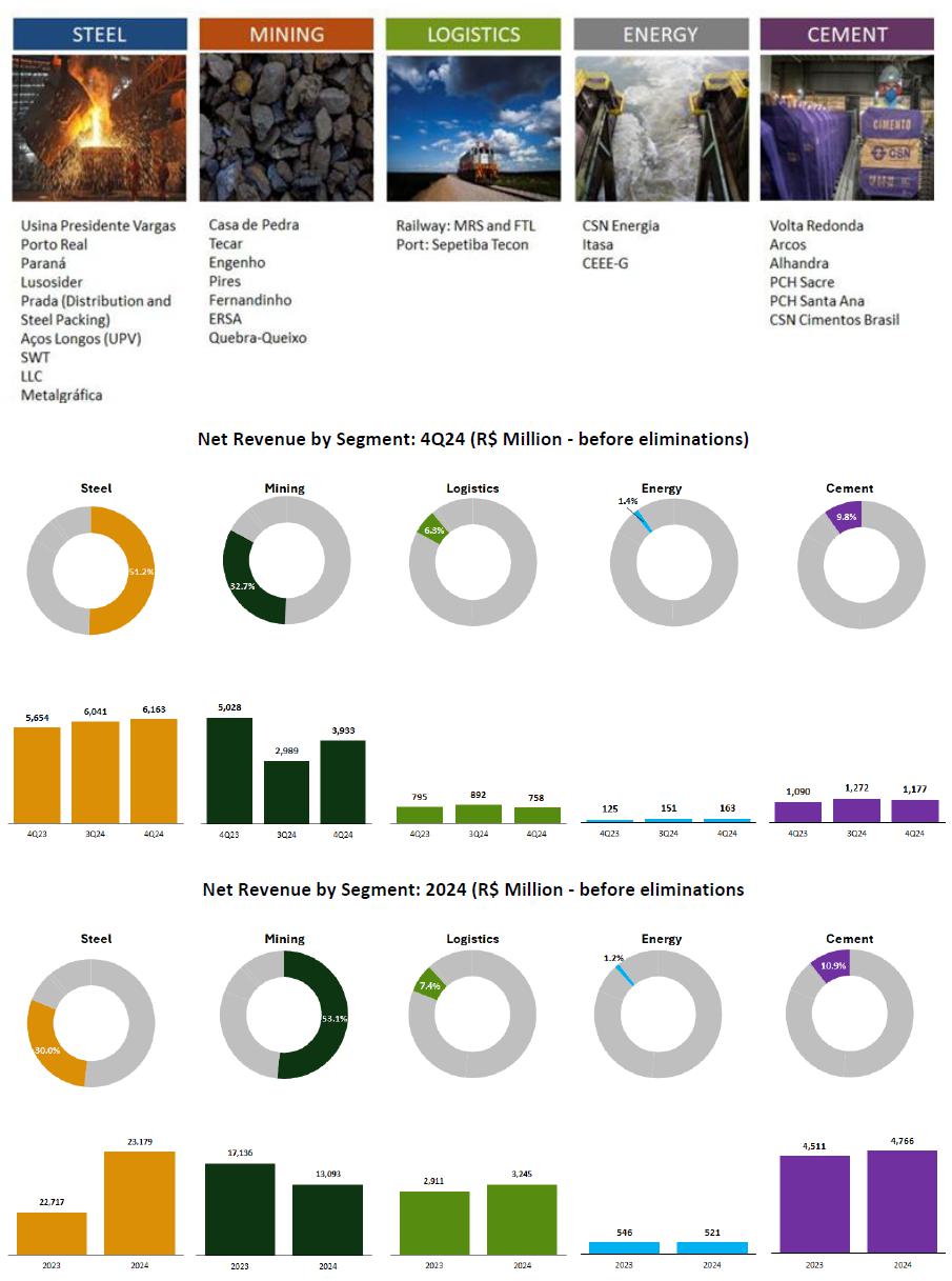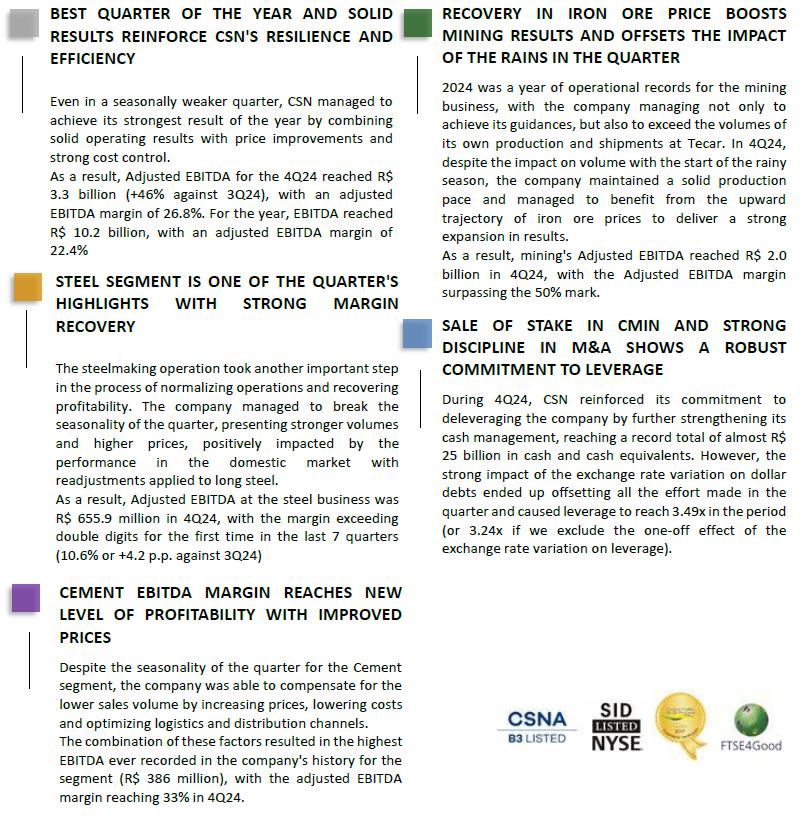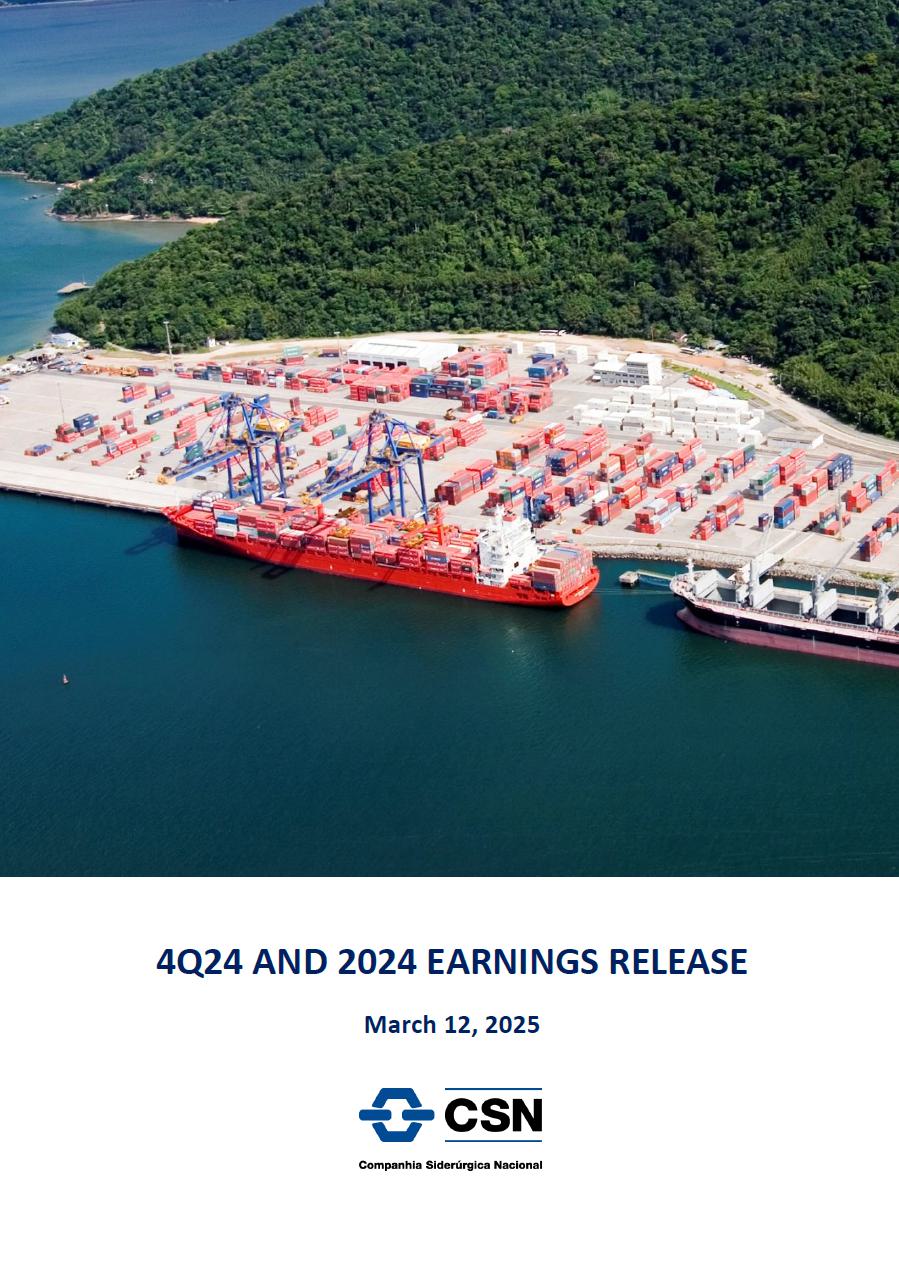 São Paulo, March 12, 2025 - Companhia Siderúrgica Nacional ("CSN") (B3: CSNA3) (NYSE: SID) announces its results for the fourth quarter of 2024 and for the year 2024 (4Q24 and 2024) in Brazilian Reais, with its financial statements being consolidated in accordance with the accounting practices adopted in Brazil issued by the Brazilian Accounting Pronouncements Committee ("CPC"), approved by the Brazilian Securities and Exchange Commission ("CVM") and the Federal Accounting Council ("CFC") and in accordance with the International Financial Reporting Standards ("IFRS") issued by the International Accounting Standards Board ("IASB").