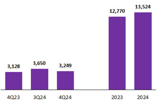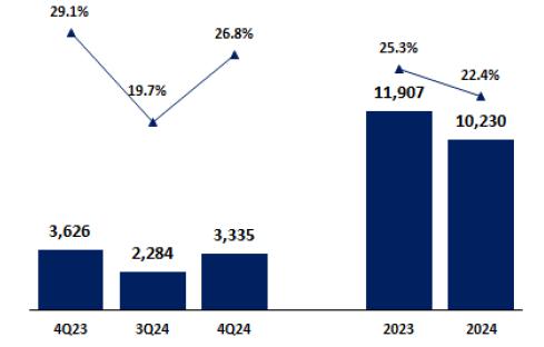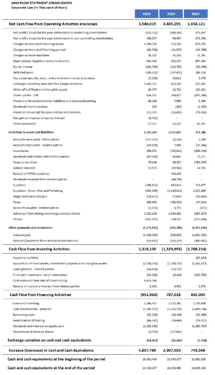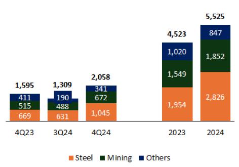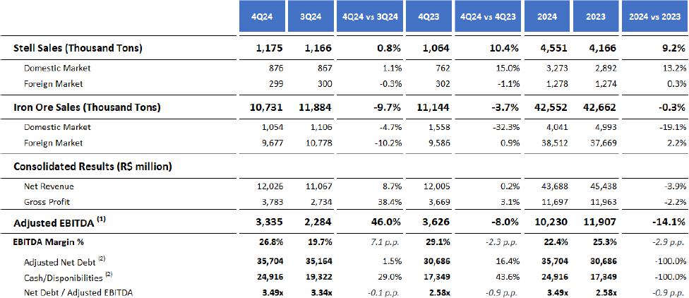 ·In turn, Gross Profit in 4Q24 reached R$ 3,783 million, an increase of 38.4% over the previous quarter, with a Gross Margin of 31.5%, which corresponds to a solid increase of 6.8 p.p. over the previous quarter. This higher profitability reflects strong revenue growth in mining, with greater cost control in steel and cement. In 2024, Gross Profit was R$ 11,697 million with a Gross Margin of 26.8%, an increase of 0.4 p.p. compared to the previous year.